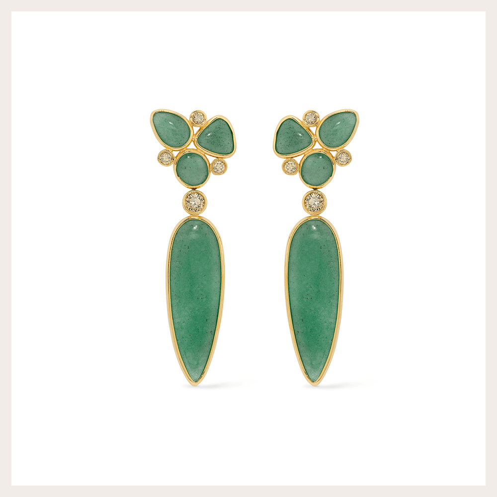 Brinco de ouro com quartzos aventurinos e diamantes light chocolate.